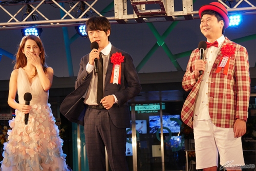 ▲左から歌舞伎町商店街振興組合理事長・片桐基次氏、新宿区長・吉住健一氏、ダレノガレ明美さん、バンダイナムコエンターテインメント代表取締役社長・大下 聡氏、ウーマンラッシュアワー・村本大輔さん、ウーマンラッシュアワー・中川パラダイスさん、東急エージェンシー代表取締役社長・桑原常泰氏