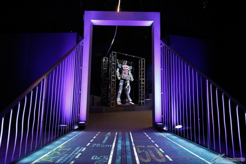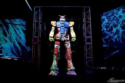 七色に輝く橋を渡ると、この土地の象徴であった実物大ガンダム立像をイメージした巨大模型が、プロジェクションマッピングやレーザーによるショーとして、”TOKYO ART CITY by NAKED”の世界に登場する。