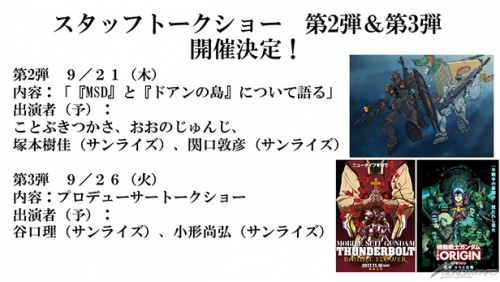 『機動戦士ガンダム THE ORIGIN』第5話『激突 ルウム会戦』は、全国35館にて4週間限定で大ヒット劇場上映中。9月21日(木)には「『MSD』と『ドアンの島』について語る」をテーマにスタッフトーク付き上映会第2弾が、9月26日(火)には谷口プロデューサーに加え『機動戦士ガンダム サンダーボルト』の小形尚弘プロデューサーが登壇し、スタッフトーク付き上映会第3弾を開催する。詳しくは、 こちらの記事をご覧ください。