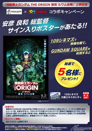 本キャンペーンは、カフェ利用を含むガンダムスクエアを利用した税込1,000円以上のレシートと、109シネマズ大阪エキスポシティで『THE ORIGIN 激突 ルウム会戦』を鑑賞した半券を合わせて応募すると、安彦良和総監督サイン入りポスターが、抽選で5人にプレゼントされるというもの。
