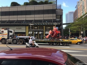 ▲巨大立像運搬中の1コマ。台湾の街中を駆け抜ける立像の姿は注目度大だ。