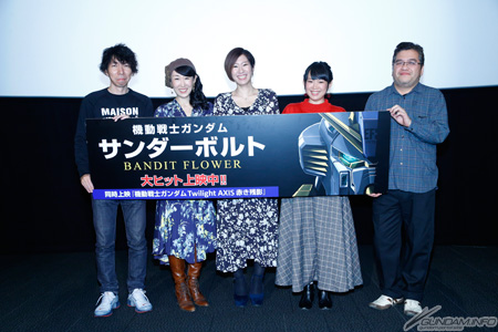 全国15館の劇場にて同時上映が行われている『機動戦士ガンダム サンダーボルト BANDIT FLOWER』と『機動戦士ガンダム Twilight AXIS 赤き残影』では、11月25日(土)に東京・TOHOシネマズ上野にて舞台挨拶が行われ、『サンダーボルト BANDIT FLOWER』よりビアンカ・カーライル役の古川由利奈さん、クローディア・ペール役の行成とあさん、カーラ・ミッチャム役の大原さやかさん、松尾 衡監督、小形尚弘プロデューサーが登壇。