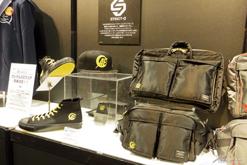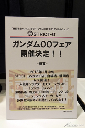 ▲メンズアパレルブランド「STRICT-G」のコーナーでは最新アイテムの紹介に加えて、2018年1月中旬より開催される「ガンダム00フェア」の販売予定商品を一部先行展示!