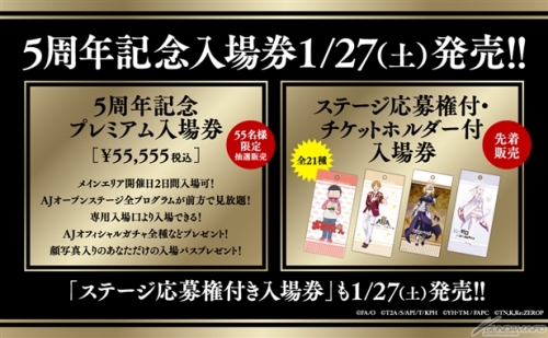 「5周年記念プレミアム入場券」には、AJオープンステージ全プログラム見放題など様々な特典が付いており、55,555円(税込)で55名限定の抽選販売を実施。