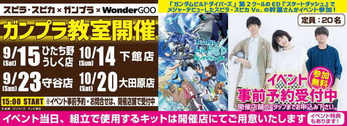 ゲームソフトや音楽CDなどを扱うエンタテインメント専門店「WonderGOO」では、『ガンダムビルドダイバーズ』第2クールのエンディングテーマを歌うスピラ・スピカのVo.幹葉さんがゲストで登場する「ガンプラ教室」が開催される。参加費無料。