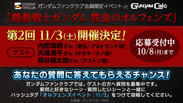 また、ガンダムファンクラブ内では、ゲストへの質問を募集中だ。質問したい内容とシーンと一緒に、ハッシュタグ「オルフェンズイベント:11/3」をつけて投稿しよう。
