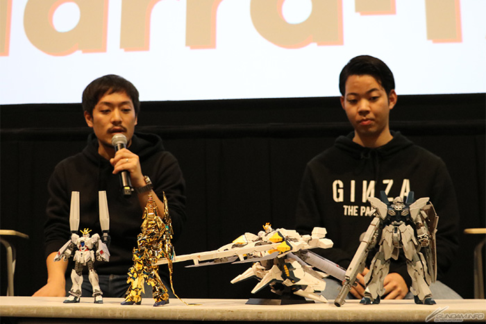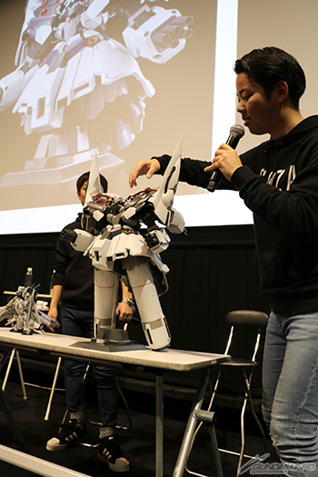 「HG 1/144 ナラティブガンダム A装備」について、福田さんは「毎週サンライズで行われるメカ打ち合わせに最初からご一緒させていただいて、メカデザインの所から関わったのですが、カトキハジメさんが模型が出るならと気合を入れて監修して下さって、Ver.Kaに近いくらいの力量と時間がかかっています。大体静岡に帰る21時半の終電に間に合わなくて…」と1年に渡って丁寧に開発していった経緯を語った。