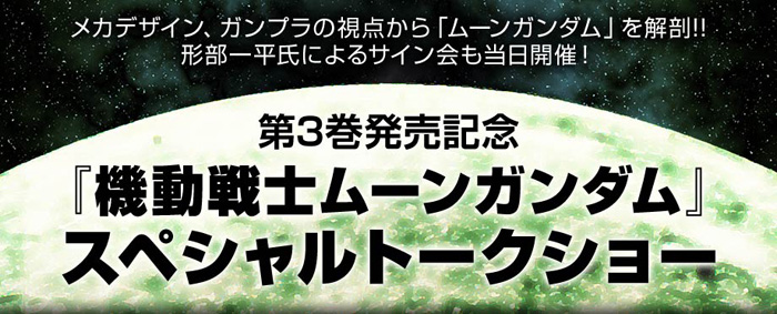 また、トークショー終了後14:30からは、「形部一平 サイン会」も実施。参加条件は、ガンプラ「HGUC ムーンガンダム」かコミックス「機動戦士ムーンガンダム」のいずれかを1つ購入すると、参加券1枚が配布される。参加券の配布は当日10:00よりスタートし、規定数に達し次第終了となるので、こちらもお見逃しなく。