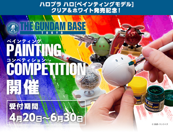 ガンプラ総合施設「THE GUNDAM BASE TOKYO(ガンダムベース東京)」では、本日4月20日(土)より、「ハロプラ ガンダムベース限定 ハロ[ペインティングモデル]クリア&ホワイト」の発売を記念した「PAINTING COMPETITION」が開催される。