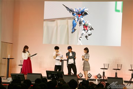 立て続けの発表が終了すると、ガンプラ紹介コーナーへ。ステージには、「HGBD:R アースリィガンダム」とアースリィガンダムの核となるユニット「コアガンダム」が登場。小林さんは、コアガンダムの一回り小さいサイズに改めて驚いていたほか、佐藤さんもハードポイントを使った換装が行える構造に感心していた。ガンプラ初心者の十味さんに対しては「(コアガンダムの換装は)海や山へ行くときに服を着替えるみたいなもの」と的確なレクチャーを行い、来場者からも同意を得ていた。