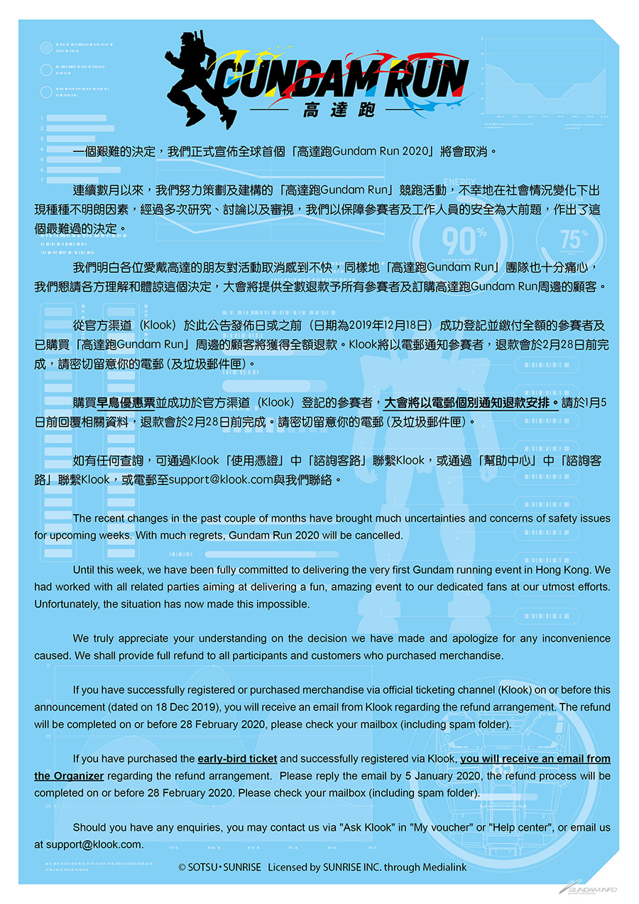 大変難しい決定ではありましたが、世界初のガンダムファンランイベント「GUNDAM RUN in Hong Kong」が中止となりました。