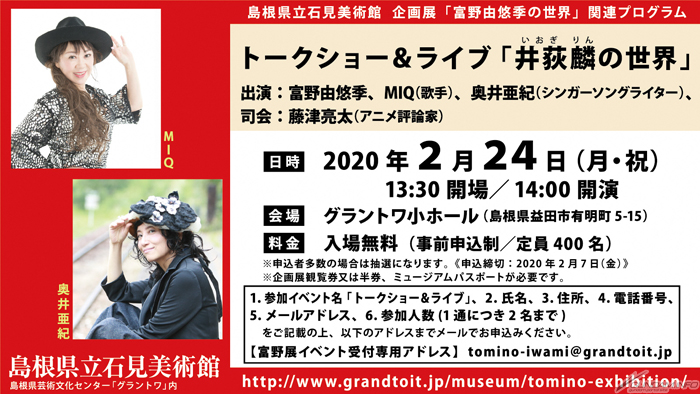 2020年1月11日(土)より島根県立石見美術館(グラントワ内)でスタートする展覧会「富野由悠季の世界」では、2月24日(月・休)にトークショー&ライブ「井荻 麟の世界」の開催が決定した。