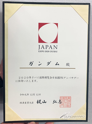 梶山経済産業大臣より”任命状”が授与される「アンバサダー任命式」には、ガンダムとともに富野由悠季監督も登壇。