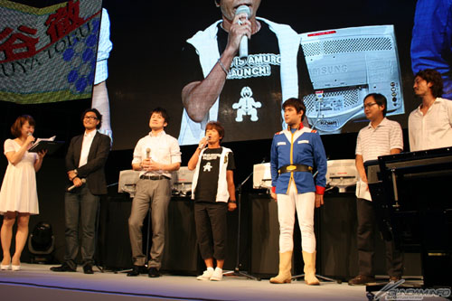 各タイトルの開発を手がけるプロデューサー陣の挨拶の後、スペシャルゲストとしてガンダム芸人の土田晃之氏、アムロのモノマネ芸人・若井おさむ氏、そしてアムロ・レイ役でお馴染みの古谷 徹氏が登場。