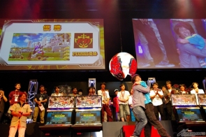 予選後に行われたステージアトラクションでは、まず始めに今回初参戦となった海外勢が紹介された。香港のゲームセンターで大勢のプレイヤーが「EXVS.MB」を取り囲んでいる映像なども上映され、本作が各地で遊ばれている様子をうかがうことができた。