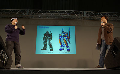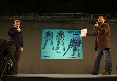 ▲「機動戦士ガンダム00」の外伝シリーズを紹介する千葉氏(右)。「機動戦士ガンダム00P(電撃ホビーマガジン展開 中)」、「機動戦士ガンダム00F(ガンダムエース連載中)」の「機動戦士ガンダム00V(月刊ホビージャパン展開中)」と、お二人はこちらでも大忙し だ!