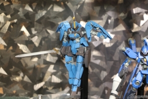 入口正面右側の「ガンプラ×モビルスーツ資料館」では、ガンプラを用いてMSが紹介されていた。第1期に登場するテイワズの主力MS「百里」と「百錬」から、第2期で新たに登場するMS「ガンダム・バルバトスルプス」や「ガンダム・グシオンリベイクフルシティ」、「ガンダム・ヴィダール」に至るまで、『鉄血のオルフェンズ』に登場するMSを所狭しと展示。