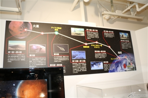 入口正面左側の「ガンプラ×鉄華団の軌跡」では、鉄華団のこれまでの激闘を振り返るジオラマを展示。鉄華団が火星から地球に至るまでの道のりを解説したパネルもあわせて展示されている。