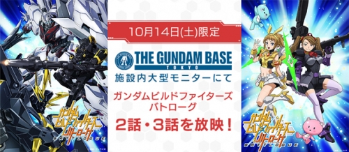 ガンダムベース東京では、10月14日(土)の1日限定で『ガンダムビルドファイターズ バトローグ』の第2話と第3話が放映される。放映は、10:30から20:30の間、1時間に一度、施設内大型モニターにて実施。(合計11回)