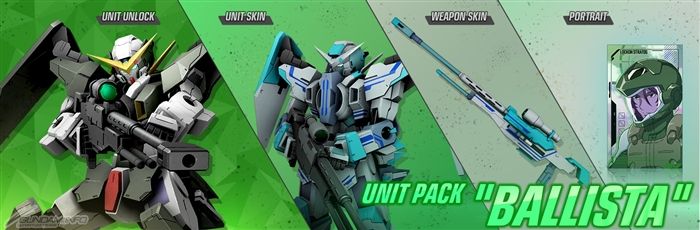 「Unit Pack "BALLISTA"」では新ユニット「ガンダムデュナメス」のアンロックに加え、ユニットスキン、ウェポンスキン、ポートレートのカスタマイズアイテムを獲得できる。