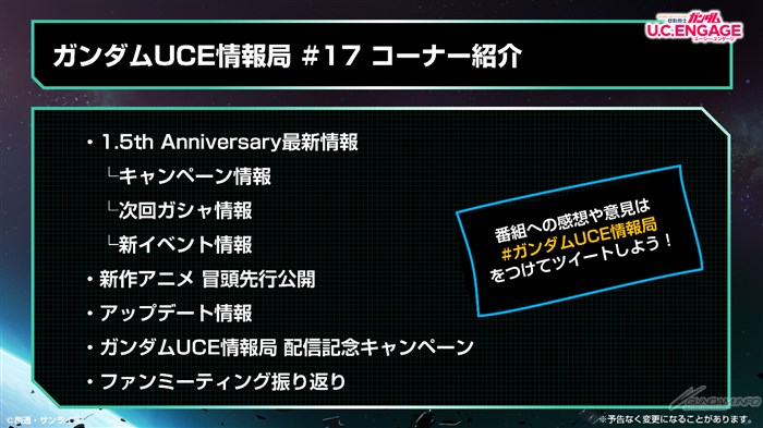 番組では、新作アニメの冒頭先行公開のほか、1.5th Anniversary最新情報やアップデート情報に加え、ガンダムUCE情報局 配信記念キャンペーン、ファンミーティング振り返りといった様々なコーナーでお届けする。ぜひチェックしてみよう