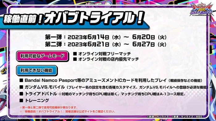 また、稼働開始に先駆けて「オーバーブースト」が体験できる「稼働直前!オバブトライアル!」の開催が決定。第1弾は6月14日(水)から20日(火)、第2弾は6月21日(水)から27日(火)までの期間に実施される。開催店舗は公式サイトで公開されているので、ぜひアクセスしてみよう。