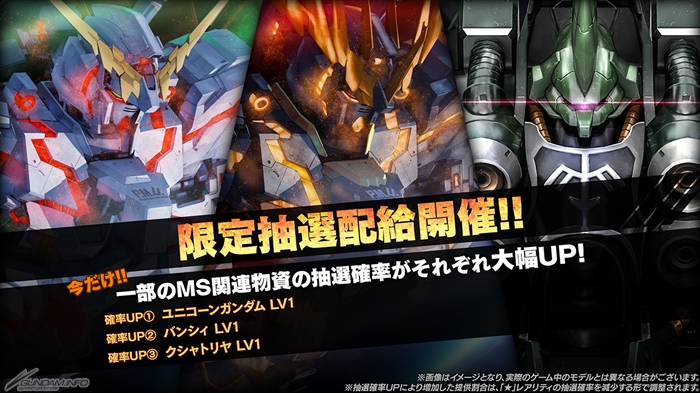 期間中、第1弾から第6弾まで、毎週特別な限定抽選配給が開催。第1弾は「ユニコーンガンダム」「バンシィ」「クシャトリヤ」の抽選確率がアップした抽選配給となっているので、この機会をお見逃しなく。
