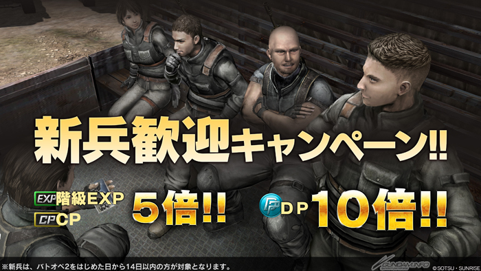 期間中に「バトオペ2」を始めた日から14日以内の新兵は、基本報酬のEXP&CPが5倍、 DPは10倍に上昇する。この機会にたくさん出撃しよう。