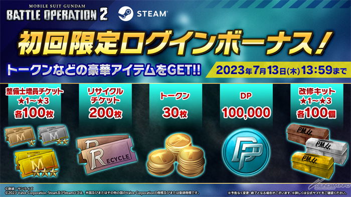 期間中の初回ログイン時に、30トークン、100,000DP、リサイクルチケット200枚、[★]~[★★★]整備士増員チケットを100枚ずつ、 [★]~[★★★]改修キットを100個ずつプレゼント。各種アイテムを入手して「バトオペ2」を楽しもう。