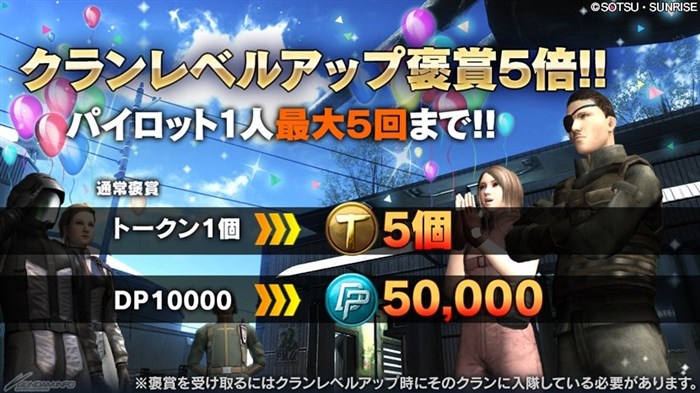 本作をはじめた日から14日以内の新兵、45日以上ログインしていなかった復帰兵限定で、戦闘報酬のEXP、CPが5倍に、DPが10倍に上昇するキャンペーンを開催。