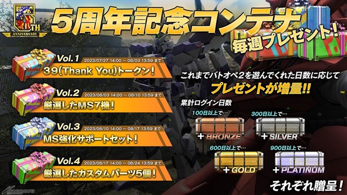 感謝の39(Thank You)トークンやMS、強化アイテムセット、カスタムパーツほか、4週にわたり毎週記念コンテナがプレゼントされる。