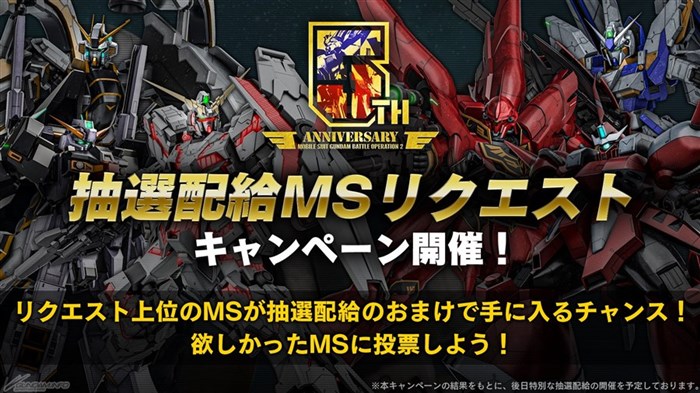 キャンペーンページにて、1日1回欲しいMSのリクエストを募集中。リクエストが多かったMSがおまけで手に入る特別な抽選配給を後日実施予定となっているので、奮って参加しよう。