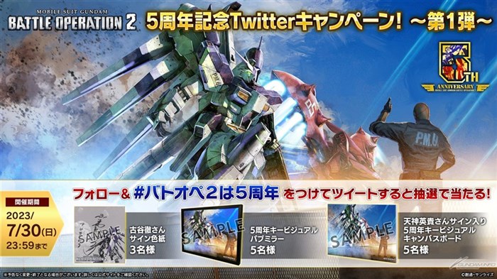 バトオペ2公式Twitter(@gundambattleope)をフォローのうえ、ハッシュタグ「#バトオペ2は5周年」をつけてツイートすると、抽選で「天神英貴さんサイン入り5周年キービジュアルキャンバスボード」や「5周年キービジュアルパブミラー」、「古谷 徹さんサイン入り色紙」があたるTwitterキャンペーンを開催中。