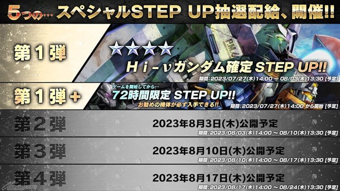 「Hi-νガンダム」を確定入手できるSTEP UP、未入手の機体が獲得できるSTEP UPなど、4週にわたりSTEP UP抽選配給を開催。