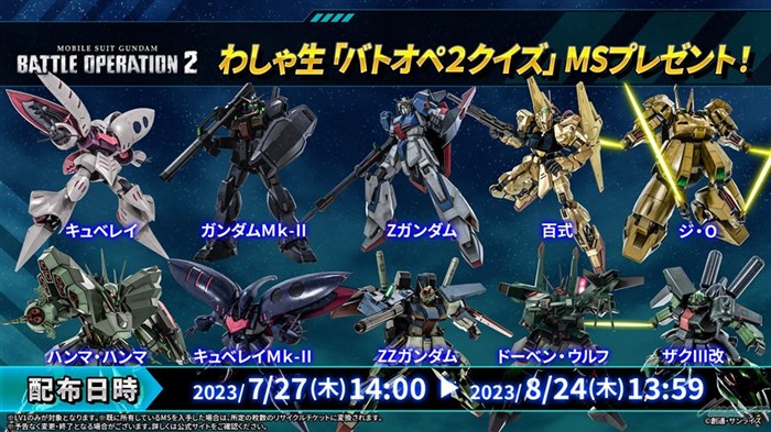 「【バトオペ2 祝5周年】マフィア梶田と中村悠一の「わしゃ生」#37【わしゃがなTV】」にて実施された「バトオペ2クイズ」において、出演者のマフィア梶田さん、中村さんが全問正解したため、全てのパイロットにMS10機体がプレゼントされる。