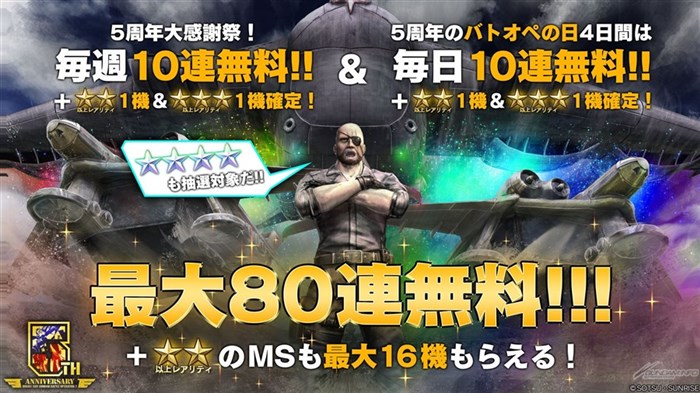 期間中、★★以上、★★★以上レアリティのMSがそれぞれ1機確定の10連無料抽選配給を毎週実施。