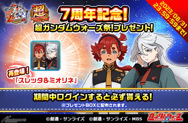 キャンペーン「7周年記念!超ガンダムウォーズ祭!」は、8月31日(木)23:59までの期間中にゲームへログインするだけで、パイロット「スレッタ&ミオリネ」がプレゼントされるなど、豪華な内容となっている。