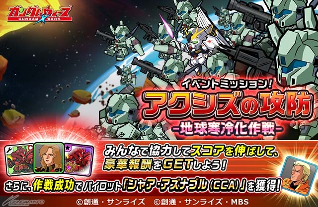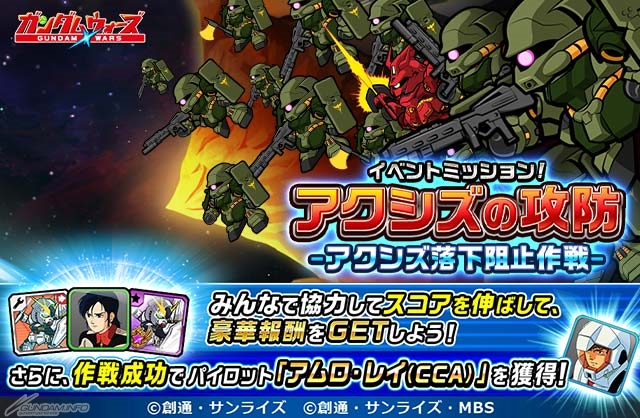 本イベントは、「地球寒冷化作戦」と「アクシズ落下阻止作戦」の2種。押し寄せる敵を時間内に倒してハイスコアを目指そう。