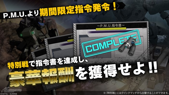 キャンペーン期間中、期間限定の特別指令が発令される。クイックマッチの「特別戦」に出撃して指令書を達成し、豪華報酬を手に入れよう。