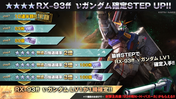 「THE LIFE-SIZED νGUNDAM STATUE」より、ロングレンジ・フィン・ファンネルを装備した、「RX-93ff νガンダム」が地上/宇宙両用、COST700の強襲機として登場。さらに、最終のSTEP7で「RX-93ff νガンダム」と射撃主兵装「93ff用N・H・バズーカ LV1」が入手できるSTEP UP抽選配給が実施されるので、この機会をお見逃しなく。