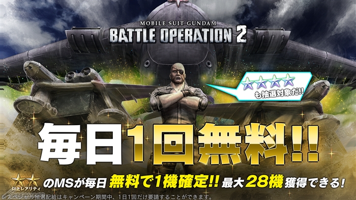 期間中、★2以上のMSが1機確定の無料抽選配給を毎日1回要請可能。最大28機のMSが獲得できるこのチャンスをお見逃しなく。