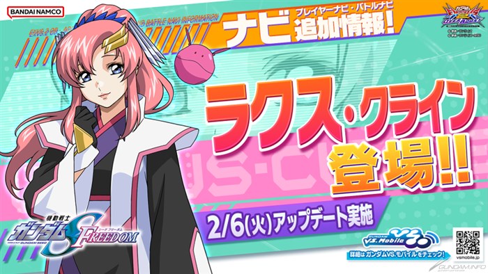 機体追加は2月6日(火)のアップデートで実施され、『SEED FREEDOM』より新ナビ「ラクス・クライン」の追加と、既存14機体のバランス調整も実施される。