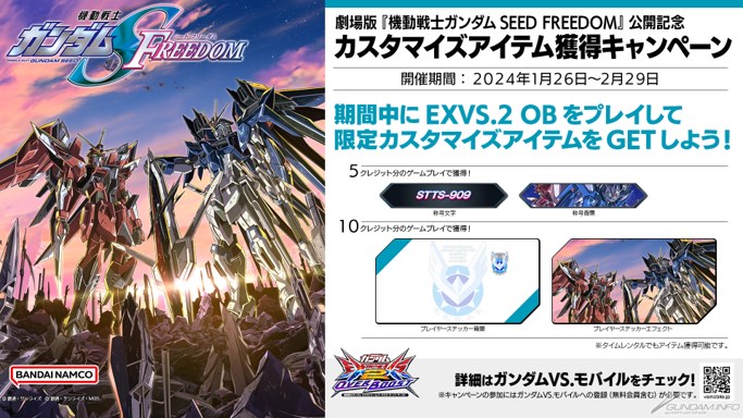 1月26日(金)から2月29日(木)の期間で、「『機動戦士ガンダムSEED FREEDOM』公開記念 カスタマイズアイテム獲得キャンペーン」が好評開催中。