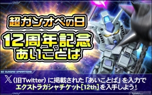 ●【予告】 「SDガンダムオペレーションズ」公式X(@sd_gundam_op)で公開される「超ガンオペの日12周年記念あいことば」を入力すると「エクストラガシャチケット[12th]×100」がもらえる!