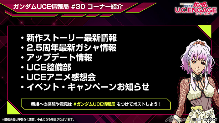 番組では、新作ストーリー最新情報、2.5周年最新ガシャ、アップデートといったアプリの最新情報から、UCE整備部コーナー、UCEアニメ感想会など、盛りだくさんの内容をお届けする。