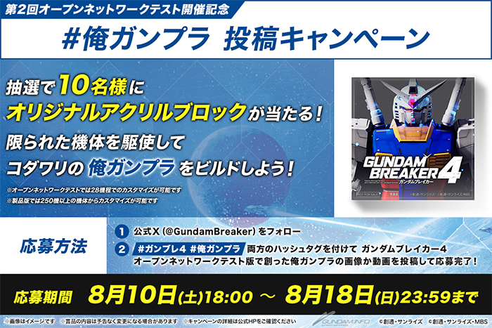 8⽉10⽇(⼟)・11⽇(⽇)に開催される「ガンダムブレイカー4 オープンネットワークテスト版」で創った“俺ガンプラ”の画像または動画を、指定のハッシュタグをつけてXに投稿した人の中から抽選で10名に「ガンダムブレイカー4 オリジナルアクリルブロック」をプレゼント。