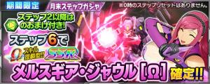 - 「カウントダウン・白日夢」の特効ユニットが獲得できる「月末ステップガシャ」開催!ステップ6ではピックアップユニット、Ωスキル搭載型のドルテ専用メルスギア・ジャウル[Ω]が確定!
