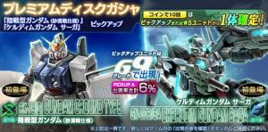 - プレミアムディスクガシャに「陸戦型ガンダム(砂漠戦仕様)」「ケルディムガンダム サーガ」が新登場!「コインで10回利用」すると、ピックアップユニットまたは★5ユニットが1体確定!