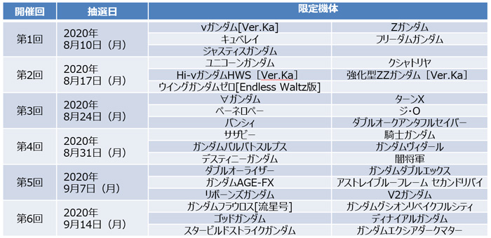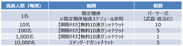 当選人数:限定機体一式34名、ガシャチケット66,660名)