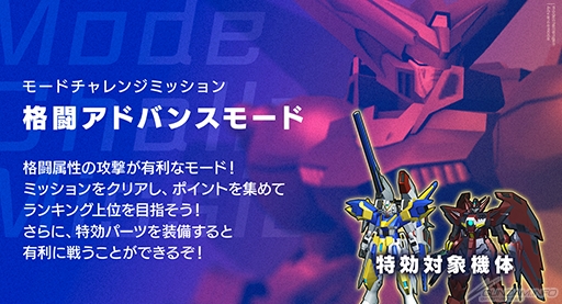 格闘攻撃が強くなり、かわりに射撃攻撃が弱くなるので、格闘に寄せたビルドでミッションをクリアし、ポイントを集めランキング上位を目指そう。さらに特効パーツを装備することで、より有利に戦うことができる。